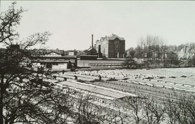 - Van Noordendijk naar Oranjelaan omstreeks 1941 met op de achtergrond het gebouw van de M.T.S. en op de voorgrond glastuinbouw.