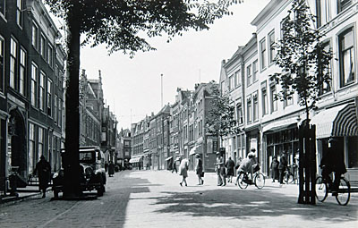 - Het Steegoversloot in de richting van de Voorstraat. Rechts na de boom zat de Nieuwe Dordtsche Courant.