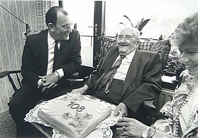 - De 108-jarige heer Jan Machiel Reyskens met burgemeestersechtpaar Noorland.