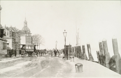 - Eindpunt van Omnibusdienst Ponsen op de Merwekade, gezien richting hotel Bellevue en de Groothoofdspoort.