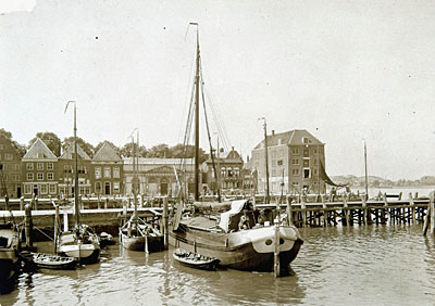 - De houten pier in de Bomhaven. In het midden de Korenbeurs op de Bomkade en rechts pakhuis Vredenburg.