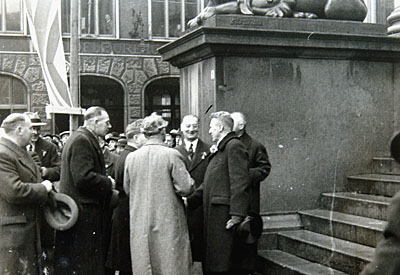 - Het bestuur van de vereniging Oranjedag wordt op het stadhuis begroet door burgemeester Bleeker.