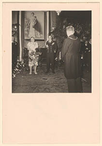 - H.K.H. Prinses Juliana en Z.K.H. Prins Bernhard der Nederlanden bij burgemeester Bleeker in de Raadszaal tijdens een bezoek aan Dordrecht.