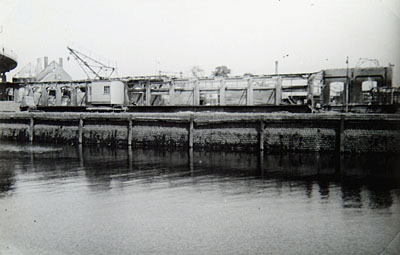 - Door beschietingen in mei 1940 beschadigde goederenloods Dok aan de 's-Gravendeelsedijk nummer 8, gezien vanuit de Spoorweghaven (of Dokhaven).