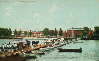 - Panorama, gezien vanaf de Oude Maas of vanaf Zwijndrecht op de Buiten Walevest met de Pontonnierskazerne en pontonbrug.