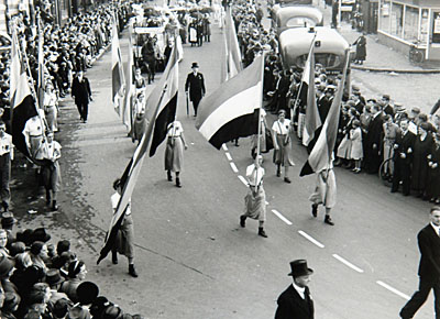 - optochten publiek / toeschouwers stadsbussen vlaggen(stokken)