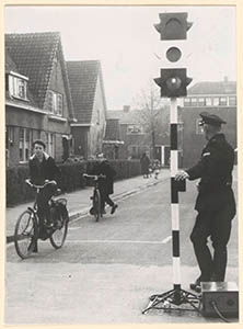 - Verkeersexamen voor de jeugd in de Mesdagstraat. Het verkeerslicht staat op de kruising van de Theophile de Bockstraat.