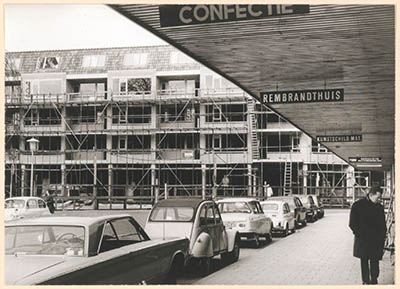 - Nieuwbouw aan de Grote Markt; rechts de in gebruik genomen winkels aan de oostzijde.