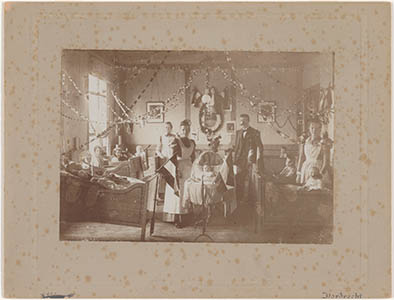 - Een van de versierde zalen van het Kinderziekenhuis aan de Ferdinand Bolsingel t.g.v. van het bezoek van koningin Emma H.H.M.M. prinses Wilhelmina aan Dordrecht. In het midden Dr. Van Troijen.