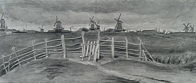 Schilderij van Vincent van Gogh met Molens aan de Weeskinderendijk Herfst 1881