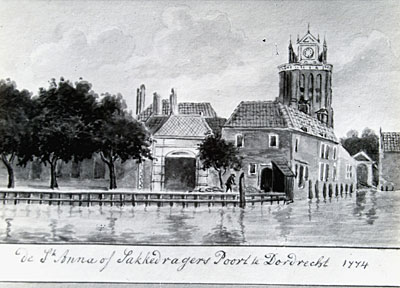 - Tekening uit 1774 van de Hooikade met St. Anna of Zakkendragerspoort