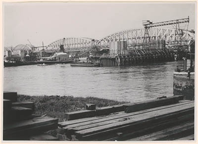 Bouw van de verkeersbrug naast de spoorbrug over de Oude Maas.