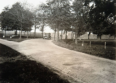 - De bocht in de Straatweg bij Amstelwijck werd in 1930 afgesneden. Links binnen het hekwerk, het bekende Wilhelminaboompje. De auto rijdt richting Willemsdorp.