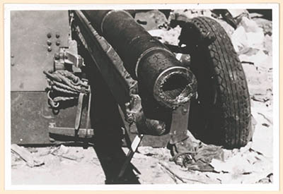 - Het op de hoek Vriesestraat/Vest opgestelde stuk antitankgeschut van het Nederlandse leger, stukgeschoten door de Duitsers in de meidagen van 1940.