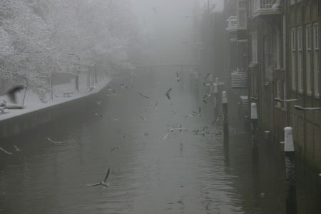 - Vliegende vogels boven de Voorstraatshaven in de sneeuw.