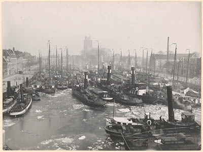 - De Kalkhaven met ijsschotsen, gezien naar het noordoosten. Links de Binnen Kalkhaven, rechts Achterhakkers.