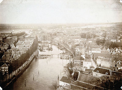 - Panorama op de Nieuwe Haven met in het midden de Lange IJzerenbrug, gezien vanuit de richting Aardappelmarkt en in de richting van de Engelenburgerbrug. Links ligt de Knolhaven