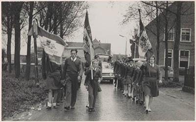 - De wandelvereninging tijdens het inhalen van de nieuwe burgemeester. Voorop als leiders de heer en mewrouw P. van Vuuren