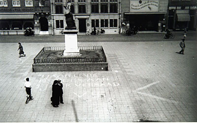 - Gekalkte leuzen op het Scheffersplein bij het standbeeld van Ary Scheffer tijdens de bezetting. Op de achtergrond Taveerne Ter Merwe, de Twentsche Bank, het Waaggebouw en apotheek Kluit en Van der Ven.