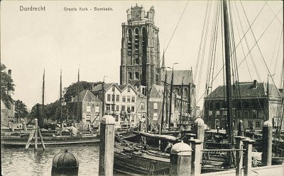 - De Grote Kerk en de achterkant van huizen aan de Korte Geldersekade, gezien over de Bomhaven. Het gebouw rechts staat aan de Bomkade.
