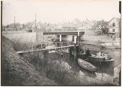 - Oosterbrug over de haven van Sliedrecht; in het water ligt een boot van de Rijkspolitie.