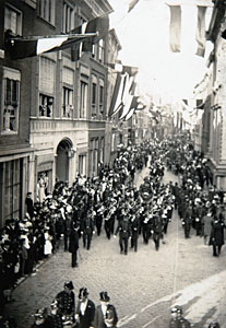 - Muziekkorpsen marcheren over de Groenmarkt vanaf de Wijnstraat