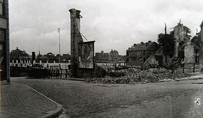 - Overblijfselen van het winkelpand met pakhuis van de firma Dicke op de hoek Prinsenstraat/Bomkade. De Duitsers hadden het in brand gestoken, omdat de ondergrondse de dochter van de grossier uit de gevangenis had bevrijd. Op de achtergrond de Bom en over de rivier Zwijndrecht.