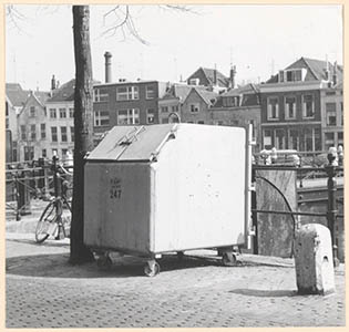 - Een container van de reinigingsdienst op de Nieuwe Haven naast de Lange IJzerenbrug. Op de achtergrond de Knolhaven.