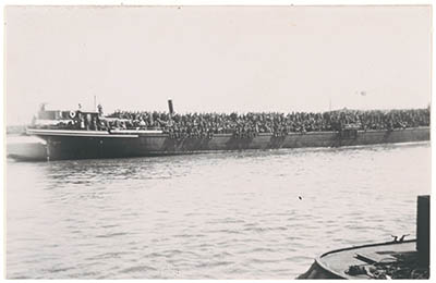 - Belgische en Franse krijgsgevangenen passeren Dordrecht over de Oude Maas op weg naar Duitsland.