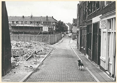 - De Heer Heymansuysstraat gezien vanaf de Vest. De huizen links staan in de Veststraat. Op het braakliggende terrein links heeft een school gestaan.