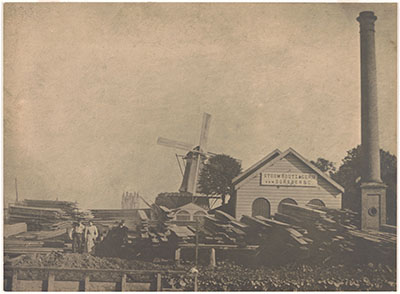 - De stoomhoutzagerij van de firma Van Dorsser en Co. aan de Lijnbaan, vanuit het westen gezien. Op de achtergrond de molen De Haas en de watertoren van de Hoogdrukwaterleiding.