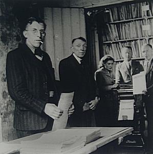- H.G. en P.W. Brand tellen de vervaardigde nummers van het illegale blad Het Nieuws. Op de achtergrond vlnr. G. Tonino, H. van den Heuvel en C. de Jong ca 1942