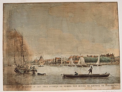 - Gezicht op Dordrecht vanaf Merwede met links Riedijkspoort en een glasoven, in het midden het Melkpoortje en rechts de Boombrug
