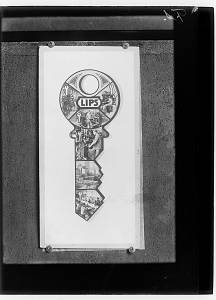 Reclame voor Lips' sloten. Sleutel met foto's van arbeiders in de slotenfabriek