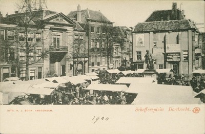 - Markt op het Scheffersplein met het standbeeld van Ary Scheffer. Antennes van de Nederlandsche Bell Telephoon Maatschappij op het dak van de Waag.
