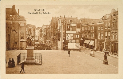 - Het Scheffersplein met het standbeeld van Ary Scheffer omstreeks 1910. Op de achtergrond de Wijnhaven en rechts de Voorstraat.
