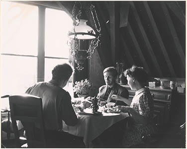 - De beeldend kunstenaars Philip Kouwen, Lou Ten Bosch en Toos Neger (v.l.n.r.) aan de maaltijd in een atelier van tekengenootschap Pictura.