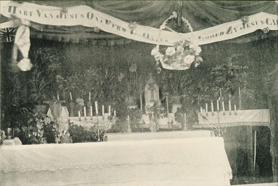 - Altaar in de noodkerk, ingericht in een op stroom liggend Belgisch schip te Papendrecht.
