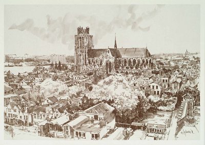 - Dordrecht, Gezicht op de oude stad met de Grote of Onze Lieve Vrouwe-kerk als middelpunt. Gotische kruisbasiliek uit de 14e en 15e eeuw met sterk Brabants karakter. Oudste deel van ca. 1280.