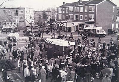 - Aankomst van sinterklaas op het Vogelplein. Rechtsboven de Billitonstraat, links flats in de Havikstraat, midden de Adelaarstraat.