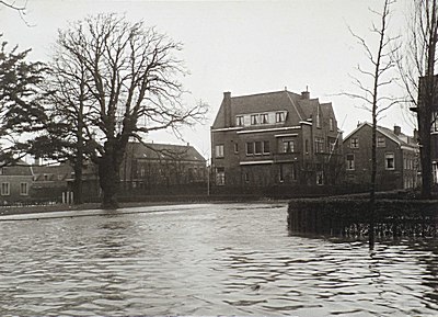 Overstroomde Godfried Schalckensingel tijdens de watersnood, gezien vanaf de Hallincqlaan.