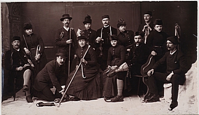- Groepsportret van leden van de Dordrechtse Sneeuw- en IJsclub naar aanleiding van een schoonrijderij op de schaats voor heren en voor heren- en damesparen in de Windhondpolder op vrijdag 3 februari 1888. Een gezelschap van 13 dames en heren poseert met de schaats in een fotostudio; het zittende meisje rechts in het midden draagt een zilveren armband om de linkerpols, die zij als 1e prijs heeft gewonnen samen met haar broer; haar naam is Betsy van Epenhuijzen (later mevr. E. Maas Geesteranus - Van Epenhuijzen, Velp) uit Zwijndrecht toen 18 jaar oud; zij had een broer B. en C., van wie C. ook een prijs won, en die mogelijk beiden ook op de foto staan; op de vloer lijkt kunstsneeuw te liggen.