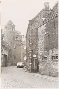 - Vanaf de Boogjes een blik richting Dolhuisstraat met het Dolhuys; verderop het Diaconessenhuis op de hoek Slikveld (bij de auto naar links) - Suikerstraat.