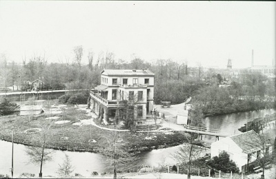 - Villa Noordhove, gezien vanaf de Oranjelaan richting Groenedijk en Park Merwestein. Rechts op de achtergrond molen Kijck over den Dijck en de elektriciteitscentrale op de Noordendijk.