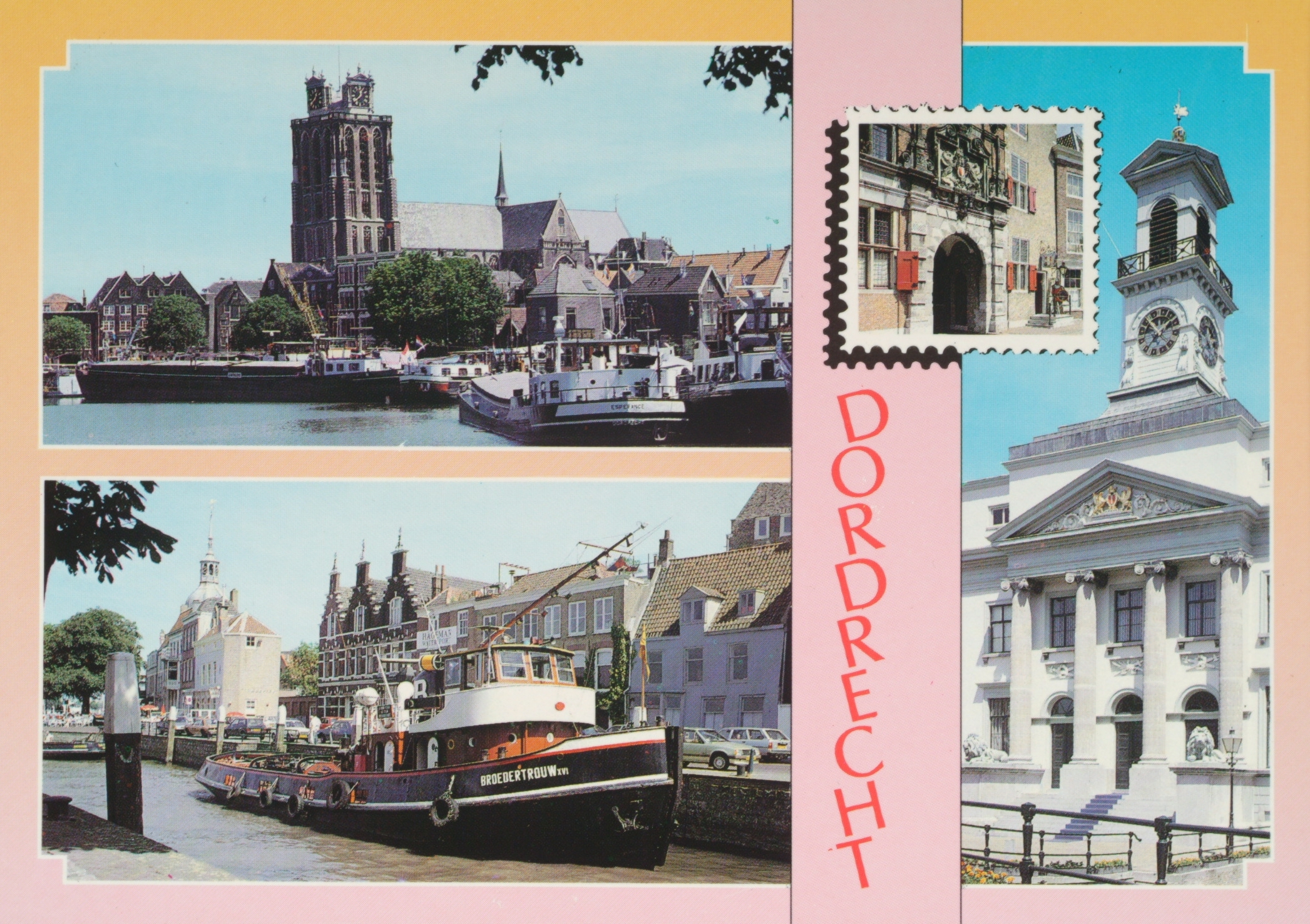 LB-Bomkade/Leuvehaven met Grote Kerk. LO-Sleepboot Broedertrouw in de Kuipershaven met Groothoofd op de achtergrond. RB-Groothoofdspoort. RO-Stadhuis.