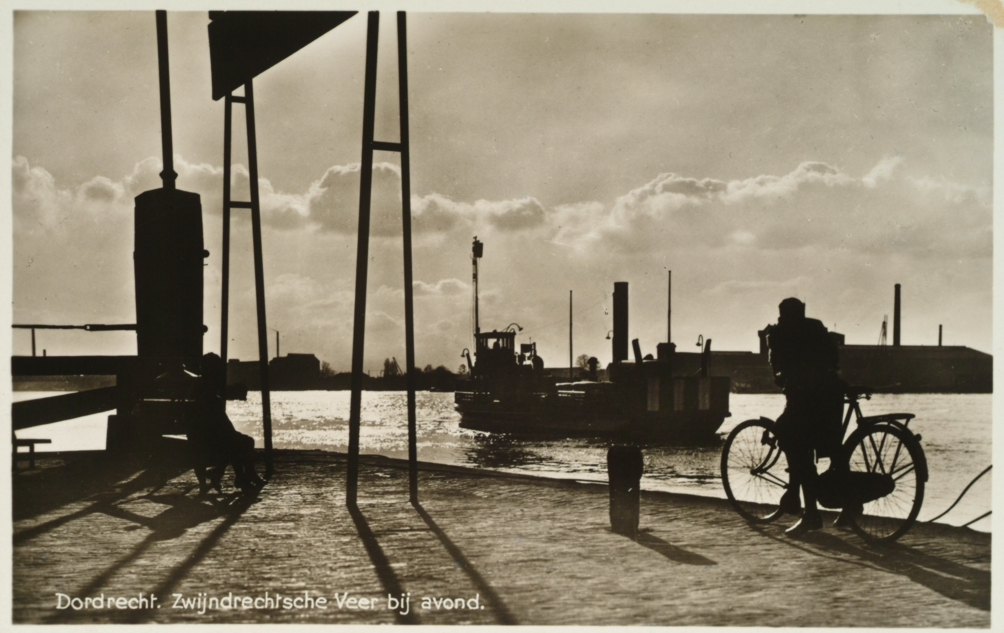 Zwijndrechts veer bij avond met rechts op de achtergrond de zoutziederij van J.de Bondt in Zwijndrecht.
