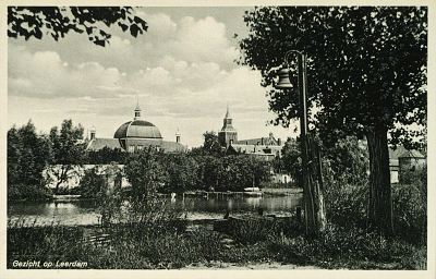 - Het Hofje van Aerden (links) en de Gereformeerde Kerk in Leerdam, gezien vanaf de zuidkant van de Linge.