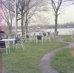 - Terras van restaurant Bellevue aan de Merwestraat in Sliedrecht, de Beneden Merwede op achtergrond.