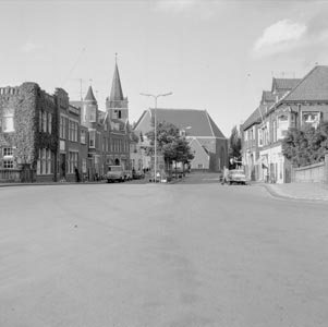 De Kerkstraat vanaf de Wilhelminastraat (links) richting de Grote Kerk aan de Kerkbuurt …