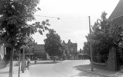 - Stationsweg in Sliedrecht die bij het spandoek overgaat in de Kerkstraat. Links/rechts de Kerkbuurt. Rechts vooraan de Protestantse Kerk.